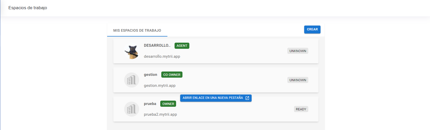 * En la parte central de la página, verás una lista con todos los espacios de trabajo (Instancias WEB) en lo que eres miembro