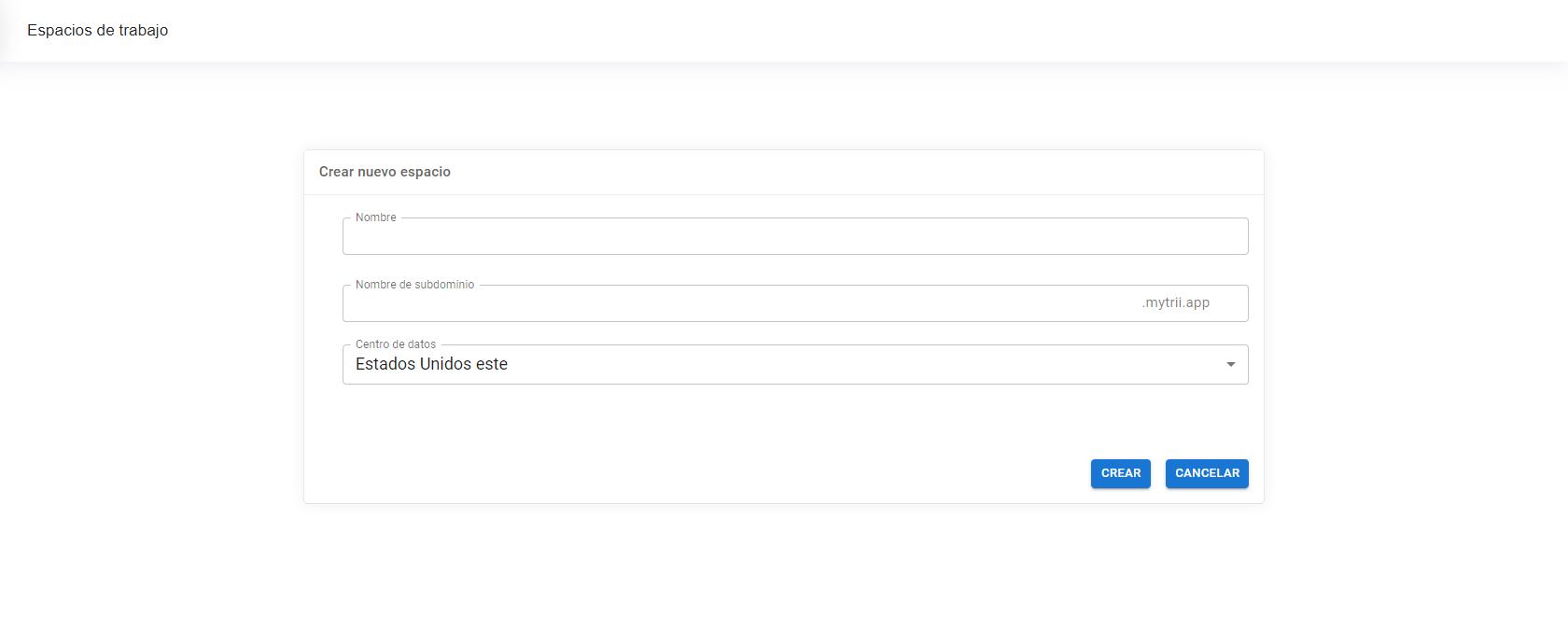 * Presionar **Crear** para la creación del espacio de trabajo o **Cancelar** para volver a la página anterior
